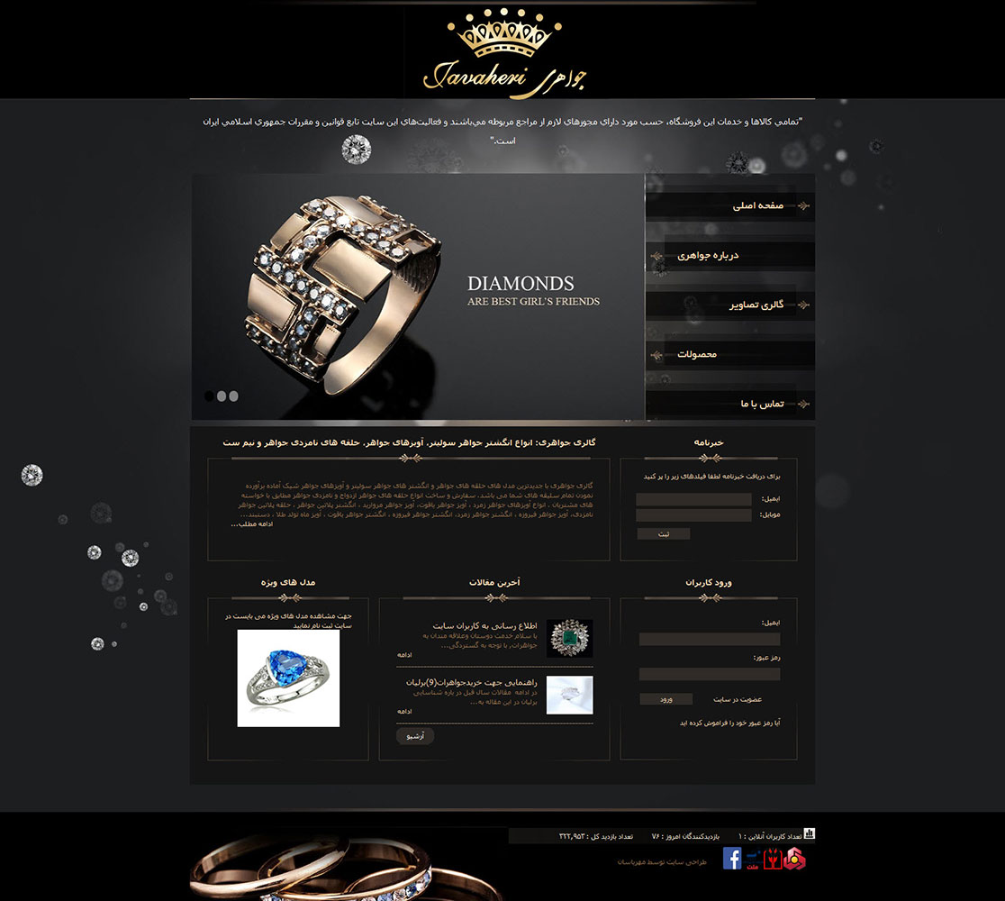 طراحی وب سایت گالری جواهری : گالری جواهری با جدیدترین مدل های حلقه های جواهر و انگشتر های جواهر سولیتر و آویزهای جواهر شیک آماده برآورده نمودن تمام سلیقه های شما می باشد. سفارش و ساخت انواع حلقه های جواهر ازدواج و نامزدی جواهر مطابق با خواسته های مشتریان . انواع آویزهای جواهر زمرد ، آویز جواهر یاقوت، آویز جواهر مروارید ، انگشتر پلاتین جواهر ، حلقه پلاتین جواهر نامزدی، آویز جواهر فیروزه ، انگشتر جواهر زمرد، انگشتر جواهر فیروزه ، انگشتر جواهر یاقوت ، آویز ماه تولد طلا ، دستبند جواهر ، دستبند طلا ، دستبند ماه تولد. مدیریت گالری جواهری رضایت خود را از طراحی سایت شرکت مهریاسان اعلام فرمودند.